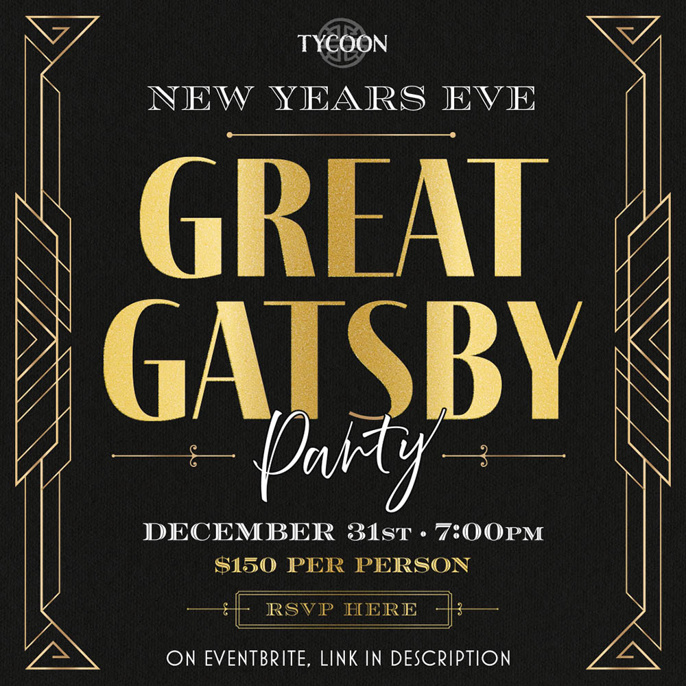 Welcome to the Great Gatsby New Year’s Eve Party! Come join us at Tycoon for a night of glitz, glamour, and celebration as we ring in the new year in style. Dress to